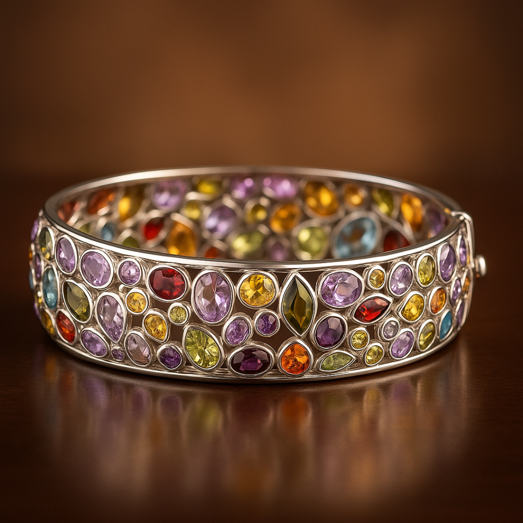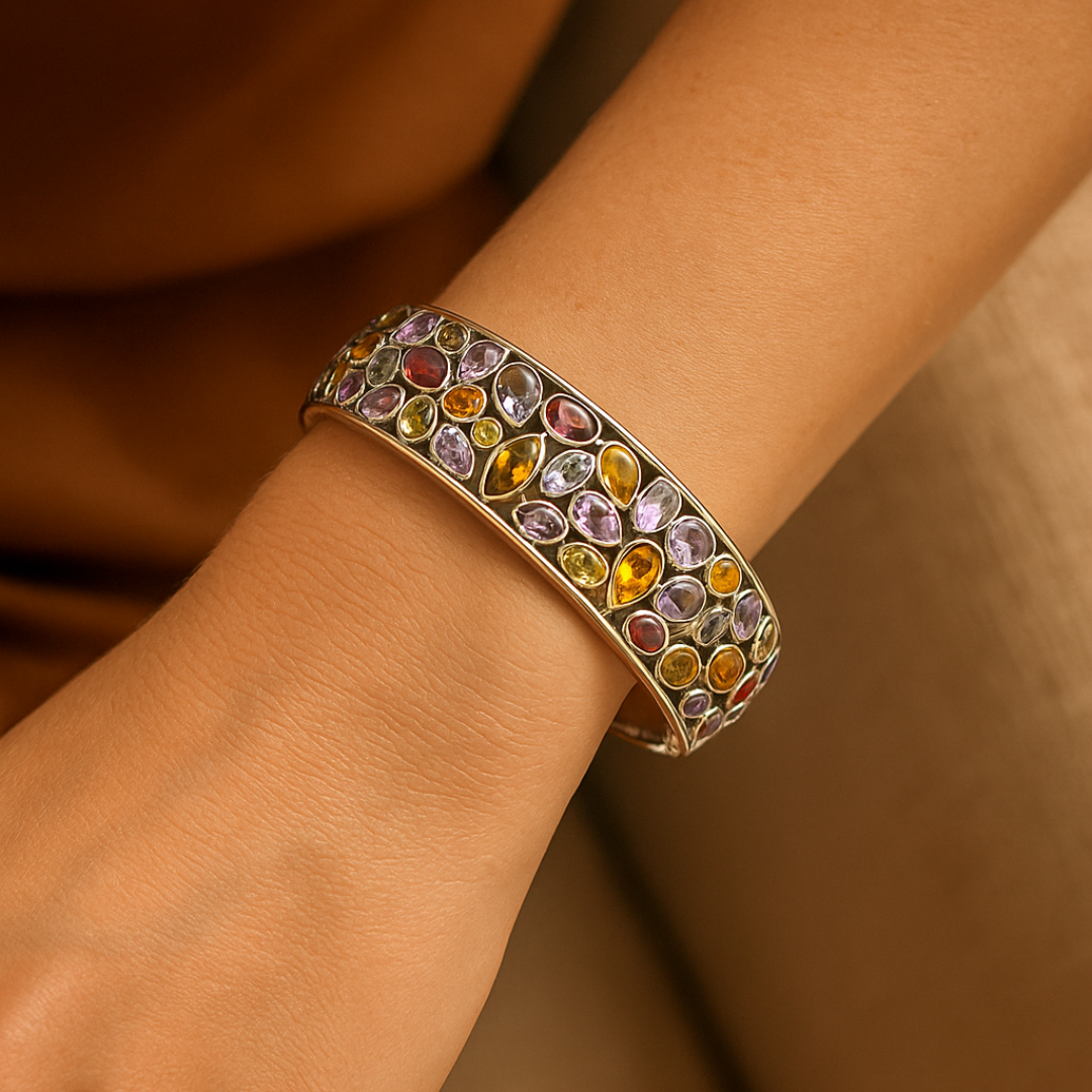 The Vivu Bijou Rainbow Gemstone Bangle is a dazzling mosaic of natural sapphires, amethysts, citrines, garnets, tourmalines, and topazes — each hand-cut in organic shapes and set in polished 18K white gold. Designed to reflect joy, creativity, and confidence, this bracelet turns every movement into a spectrum of light.